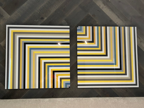 Pair of photoart prints on glass in stripes of Yellow, black white, gray and slate blue.