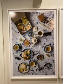 Large custom framed archival pigment print under glass by artist Christos Palios (Greek American 1979 - ). Edition of 8. Image shows tablecloth laden with food and drink. From the artist’s “Conversations” series.