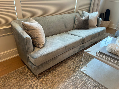 Group of 3 custom textured velvet pillows with down inserts: 2 large 21” squares in pale gray; 1 18” square in charcoal.