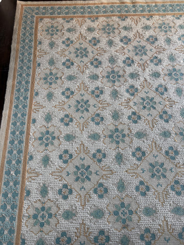 Large custom wool carpet in shades of aqua, cream and tan in Portugese grospoint finish. Very good condition.