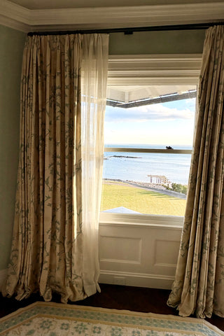 Custom linen draperies in shades of aqua, tan and cream.