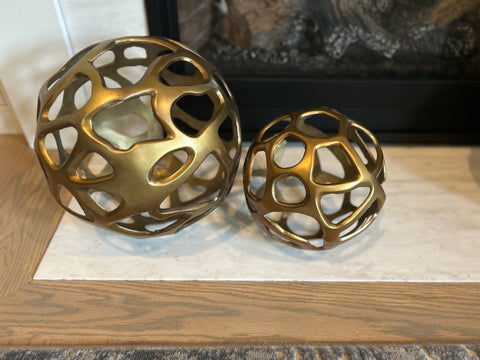 Pair of decorative open brass balls in 2 sizes: 13” diameter and 9” diameter. Great accessory for table top or bookshelves.