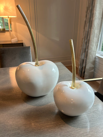 Pair of large, oversize cherries as sculptures: white lacquer finish with brass stems. Identical pieces in two sizes.