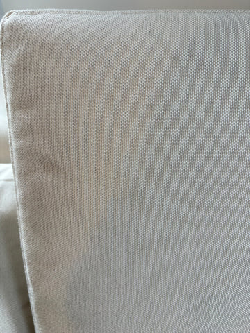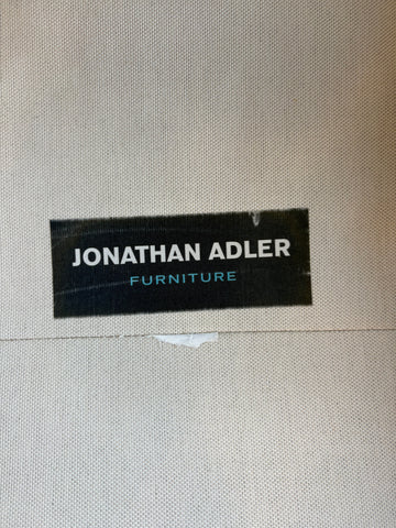 Jonathan Adler "Topanga" sectional sofa in off-white linen. Cushions are spring down construction; legs are stainless steel. Sofa measures 95"w x 37"d x 30h" (left arm: 58"w; right arm: 95" w) and is in overall good condition. Retail price: $6,200.