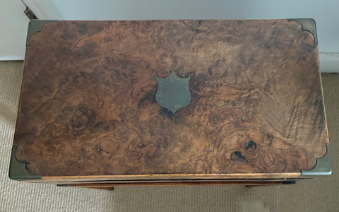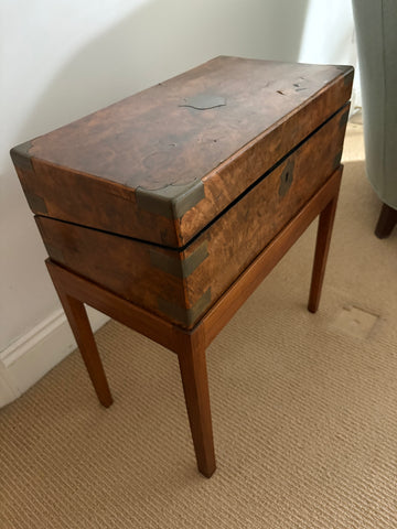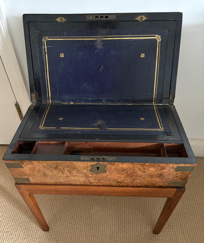 19th c burlwood writing box on custom stand. Top of box has brass shield plaque. Interior of box is fitted as writing box to hold paper, pens and ink bottles with gold embossed black leather writing surface. Good condition. Makes charming character side table.