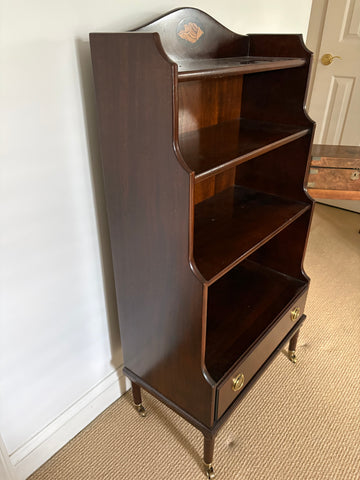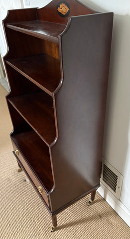 Traditional mahogany bookcase with 4 shelves and lower drawer. Bookcase is on 4 small brass casters for mobility. There is an inlaid shell motif at center top. Great size, classic style. Hard to find item in excellent condition!