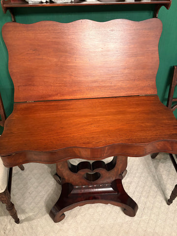 Antique 19th c Empire mahogany pedestal table with flip top. The table top has beautiful bookmarked flame mahogany veneers. Table can be used multiple ways - with top down as side table, with top up as console table, or with top fully opened up as square game table. Very good condition.