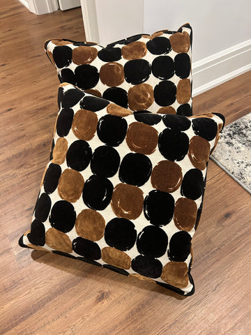 Pair of custom 22” down pillows - chocolate brown and black circles on cream background. Very good condition.